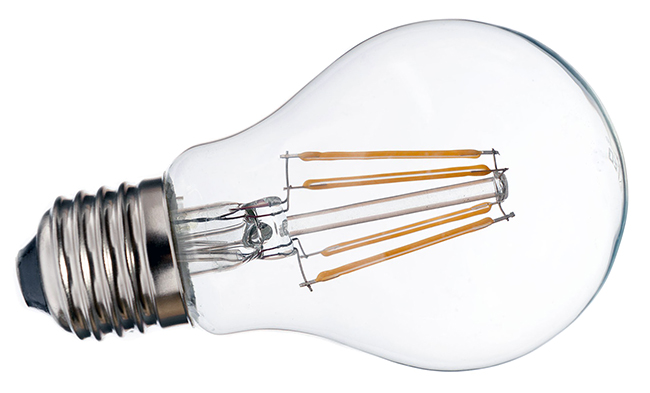 Светодиодный филамент – это стеклянный стержень прямоугольного или круглого сечения, на котором установлены миниатюрные кристаллы светодиодов методом COG (Chip-on-Glass). Все светодиоды одной палочки филамента образуют последовательную электрическую цепочку с анодом и катодом на концах. Её мощность потребления, как правило, составляет 1 Вт. Таким образом, количество стержней в колбе указывает на мощность лампы. На каждый светодиодный филамент наносится толстый слой силиконового люминофора желтого цвета. Он препятствует прохождению ультрафиолета и способствует равномерному рассеиванию светового потока. Цветовая температура светодиодов соответствует тёплому или нейтральному диапазону, чтобы наиболее точно имитировать предшественников с вольфрамовой нитью.