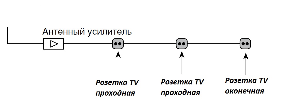 Также оконечные розетки используются, в конце ответвлений после разветвителя (схема "Звезда") или когда к телевизору подходит один единственный кабель (в случае отсутствия одиночных).