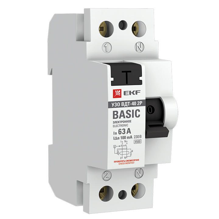 • Устройство защитного отключения УЗО ВДТ-40 2P 63А/ 30мА (электронное) EKF Basic BASIC, 2 полюса, 63А, тип - AC, 30 мА