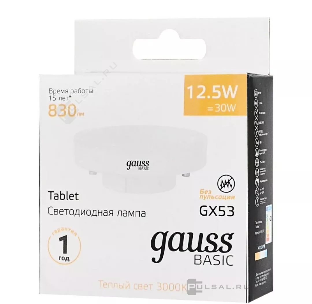 Elementary, цоколь - GX53, мощность - 13Вт, световой поток - 890Лм, цветовая температура - 3000К, не диммируется, 83813, Gauss