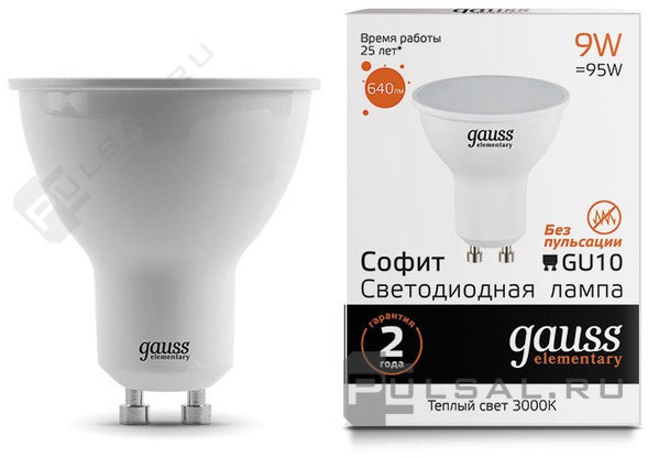 Лампа светодиодная Elementary, цоколь - GU10, мощность - 9Вт, световой поток - 640Лм, цветовая температура - 3000К, не диммируется, 13619, Gauss