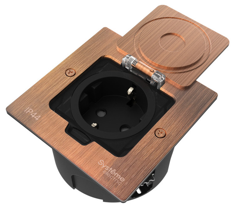 Лючок MultiDesk с розеткой и монтажной коробкой для стены, фальшпола, стола MultiDesk, W45, напольная, для сплошных стен, для столов и мебели, для полых стен и гипрока, 1 пост, цвет - медь