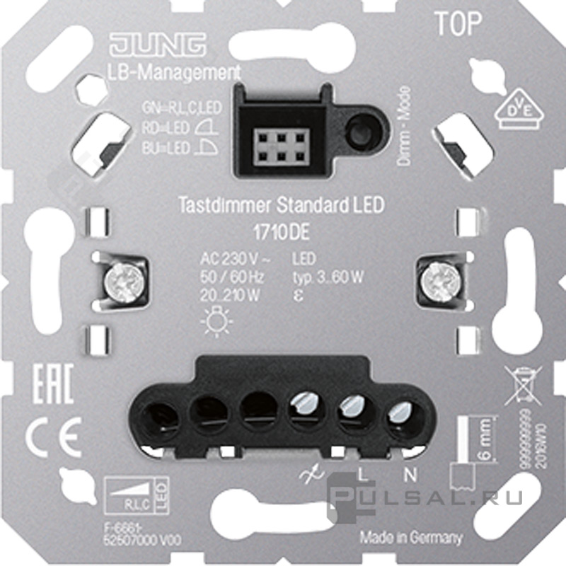 Механизм светорегулятора (диммера) 20-210 Вт/ВА, для LED 3-60 Вт A VIVA, A creation, A 550, A flow, AS 500, CD 500, CD plus, LS 990, LS plus, LS-design, SL 500, клавишный, с возможностью управления с 2-х мест, лампы накаливания и галогенные 220В (R), лампы с индукционным (обмоточным) трансформ.(L), лампы с электронным (емкостным) трансформ.(C), диммируемые лампы LED 220В (LEDi тип L), диммируемые лампы LED 220В (LEDi тип C)