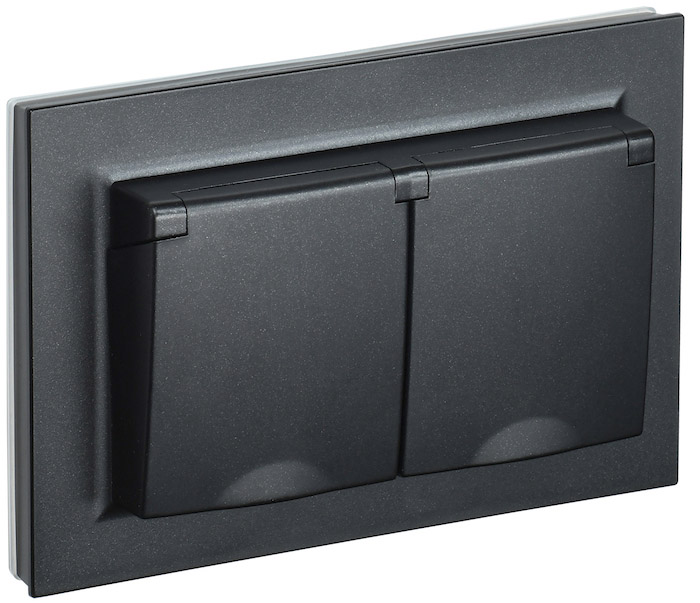 Розетка-моноблок BRITE, со шторками, с крышкой, с заземлением, двойная, винтовые клеммы, цвет - черный