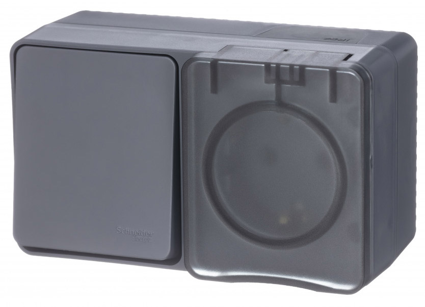 Блок, розетка + выключатель Atlas Design Profi 54, со шторками, с крышкой, с заземлением, одинарная, винтовые клеммы, цвет - антрацит