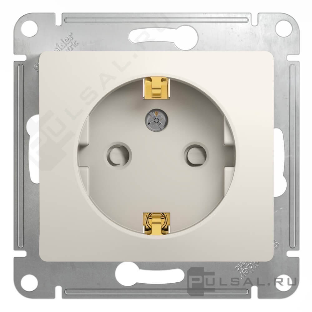 Розетка Glossa, со шторками, с заземлением, одинарная, винтовые клеммы, цвет - молочный
