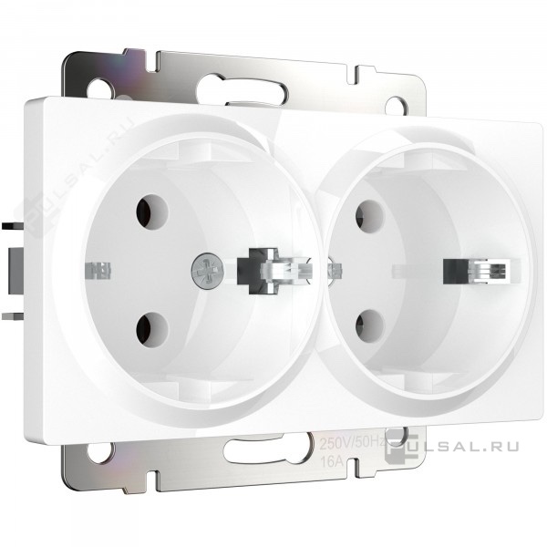 Розетка Alumax, Slab, Senso, Baguette, Acrylic, Platinum, Elite, Snabb, Stream, Flock, Stark, Fiore, Favorit, Diamant, Aluminium, Antik, Metallic, без шторок, с заземлением, двойная, винтовые клеммы, цвет - белый