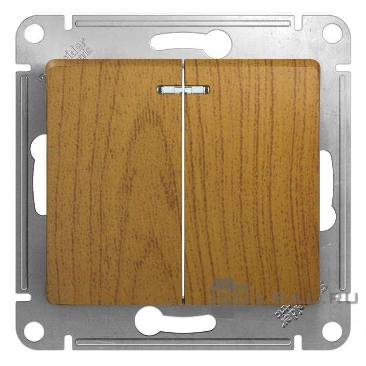 Выключатель Glossa, двухклавишный, с подсветкой, цвет - дуб