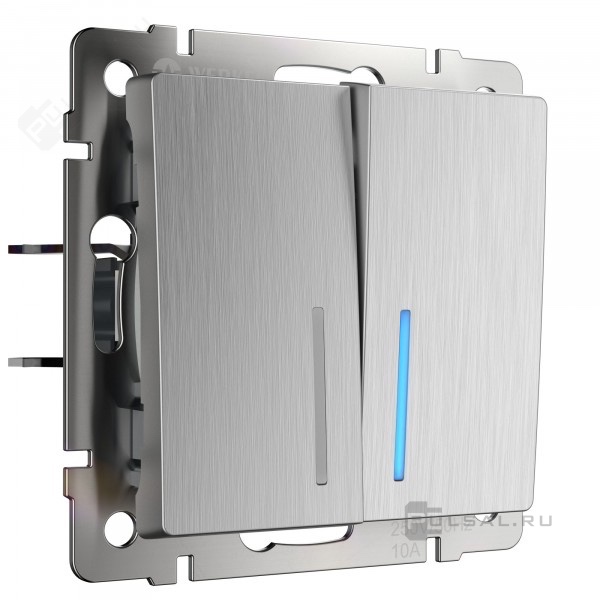 Выключатель Alumax, Split, Slab, Senso, Baguette, Acrylic, Platinum, Elite, Snabb, Stream, Flock, Stark, Fiore, Favorit, Diamant, Aluminium, Antik, Metallic, двухклавишный, с подсветкой, цвет - серебряный рифленый