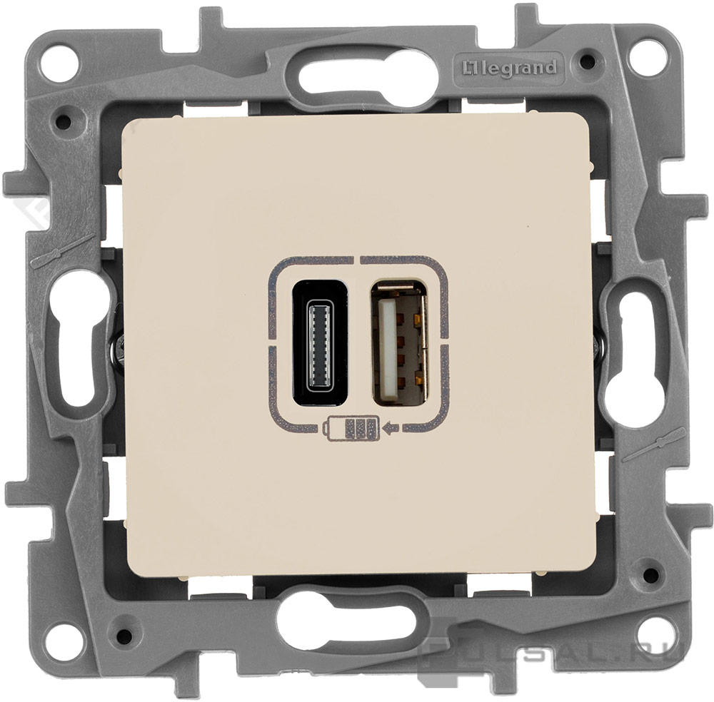 Розетка USB type-C + type-A, 3.0А Etika, USB type-C 5V, USB type-A 5V, двойная, цвет - слоновая кость