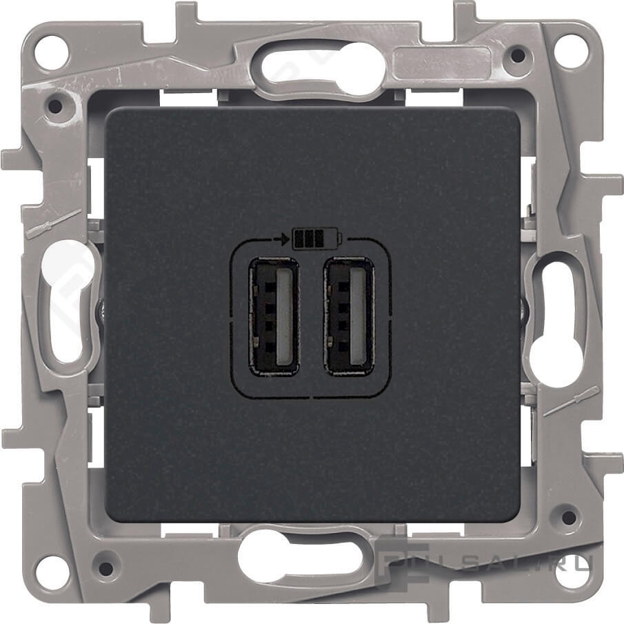 Розетка USB, 2.4А Etika, USB type-A 5V, двойная, цвет - антрацит