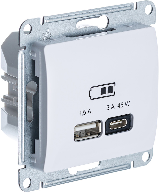 Розетка USB type-A+C 45 Вт с быстрой зарядкой Glossa, USB type-C 5V, USB type-A 5V, двойная, цвет - белый