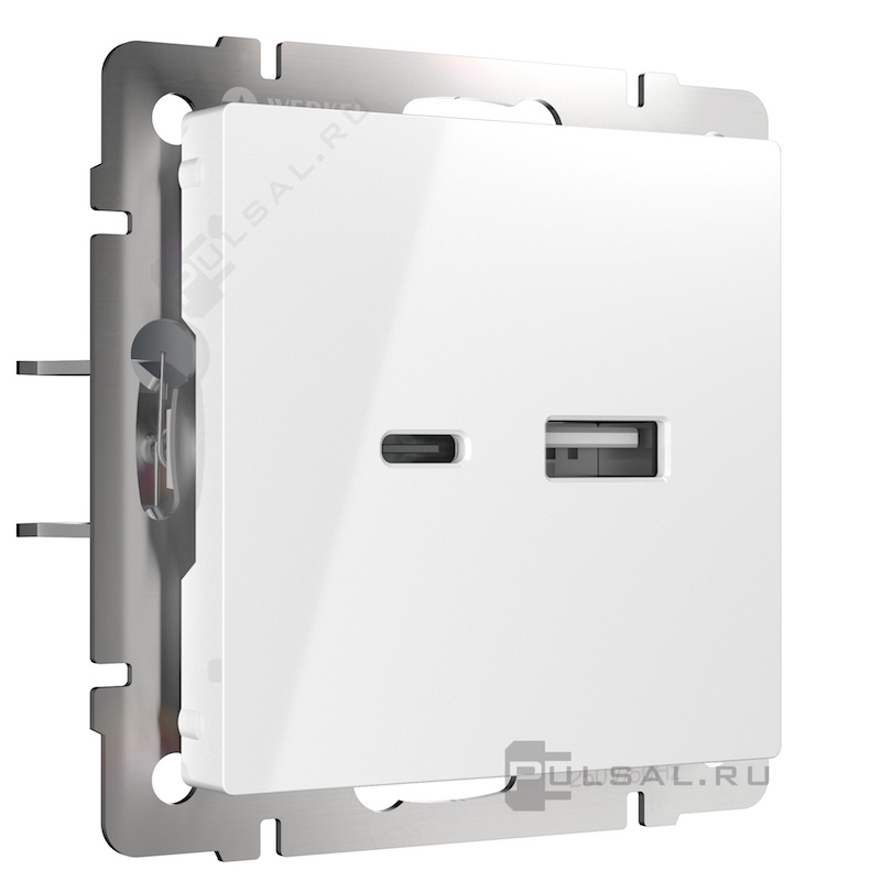 Розетка USB A+C, 3.0А с электрической розеткой Alumax, Split, Slab, Senso, Baguette, Acrylic, Platinum, Elite, Snabb, Stream, Flock, Stark, Fiore, Favorit, Diamant, Aluminium, Antik, Metallic, USB type-C 5V, USB type-A 5V, Электр. с USB, двойная, цвет - белый